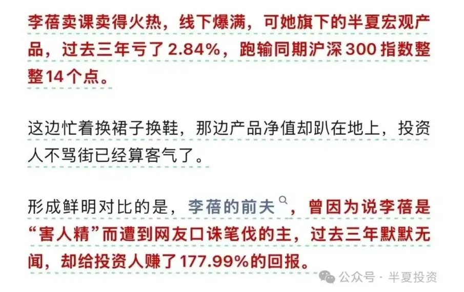 此外,李蓓还在文中回应了近期网络上对其业绩的质疑,称部分黑粉在谈论其业绩时,刻意挑选3年业绩数据进行攻击,却对1年、5年业绩避而不谈。她明确表示,看1周,宏观策略与股票策略表现黯淡,自己一枝独秀;看1年,半夏投资业绩强劲修复,半夏平衡(中波动)产品跑赢沪深300指数超过15%;看5年,尽管期间有波折,半夏平衡(中波动)产品仍位列行业前1/3。目前,半夏投资旗下高波动、中波动、低波动的旗舰基金,均已创下净值新高,她坚信未来将用业绩证明自身实力,并喊话梁文涛“两年后业绩说话”。