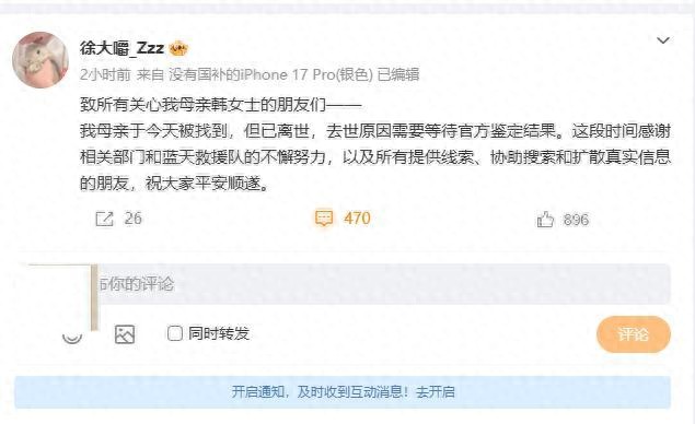 极目新闻记者 詹钘 2月10日晚,花墙乐队主唱徐先生发文称,其母亲已经在当天被找到,但已经离世。极目新闻记者从接近救援队的知情人处了解到,其母亲韩某民在距离失踪地大概6公里远的河道下游被发现。  徐先生发文,图源:网络截图 徐先生在微博上发文写到:“我母亲于今天被找到,但已离世,去世原因需要等待官方鉴定结果。这段时间感谢相关部门和蓝天救援队的不懈努力,以及所有提供线索、协助搜索和传播真实信息的朋友,祝大家平安顺遂。” 此前多个账号公开发布的寻人信息显示,走失者韩某民,女,57岁,患有抑郁症,于1月27日17时40分左右,在通州北运河绿道沿线向南步行后失联,至今未归。经排查,疑似行至通州区三大文化建筑附近后失去踪迹,因沿岸摄像头未启用,具体行踪无法确认。  搜救现场,图源:网络 2月1日,徐先生曾告诉极目新闻记者,母亲走失后,身边认识的朋友和亲戚都已经问过了,没有发现母亲的身影。对于监控摄像头未启用的情况,徐先生表示:“不知道为什么监控没有启用,我也想监控能够拍到她,但是没有。”徐先生称已经报警处理,并有救援队参与搜寻工作。 10日夜间,有接近救援队的知情人士向极目新闻记者确认,韩女士已经被找到。该知情人称,此前救援队在水域中打捞多日没有找到,直到9日还在使用声呐搜寻。10日15时许,有人发现了韩女士的踪迹并报警。该知情人称,找到韩某的位置在河道下游,离失踪地大概6公里左右。 (来源:极目新闻)