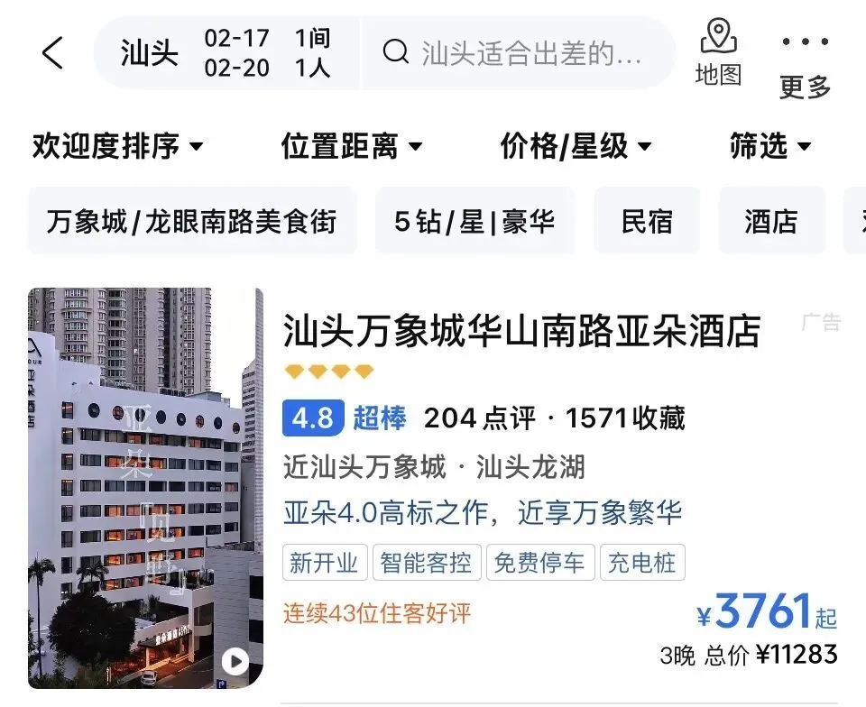 “汕头亚朵酒店春节一晚4200”“四川一县城300元客房春节涨到1200”等话题被挂上热搜榜。
