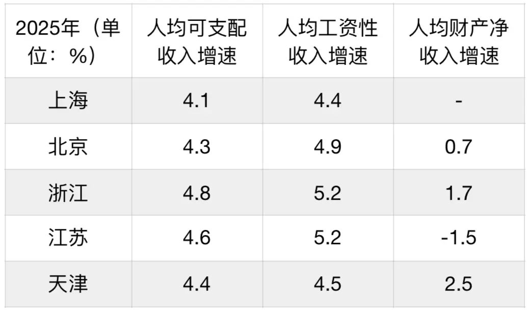2025年,最富五地的工资性收入增速均超过居民收入增速,但仍低于同期GDP增速。