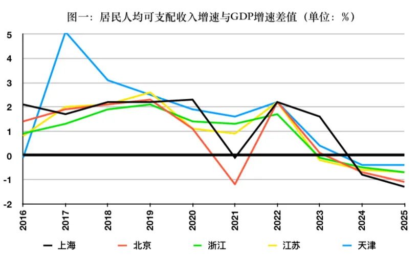 但在2024年,数据走势迎来拐点。如图一,从2022年开始,最富五地的居民收入与GDP增速差值开始快速下滑,2024、2025年差值均为负值,这意味着居民收入增速连续低于GDP增速。