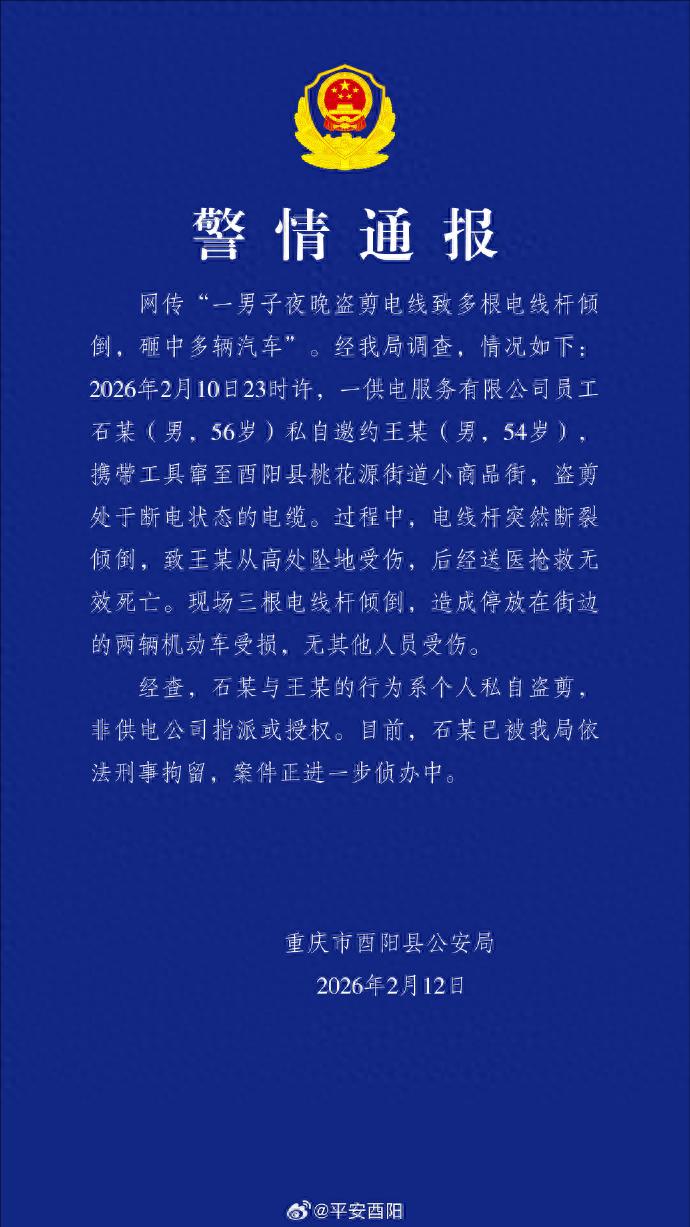 2月12日,重庆市酉阳县发布警情通报: 网传“一男子夜晚盗剪电线致多根电线杆倾倒,砸中多辆汽车”。经我局调查,情况如下:2026年2月10日23时许,一供电服务有限公司员工石某(男,56岁)私自邀约王某(男,54岁),携带工具窜至酉阳县桃花源街道小商品街,盗剪处于断电状态的电缆。过程中,电线杆突然断裂倾倒,致王某从高处坠地受伤,后经送医抢救无效死亡。现场三根电线杆倾倒,造成停放在街边的两辆机动车受损,无其他人员受伤。 经查,石某与王某的行为系个人私自盗剪,非供电公司指派或授权。目前,石某已被我局依法刑事拘留,案件正进一步侦办中。  (来源:平安酉阳) |