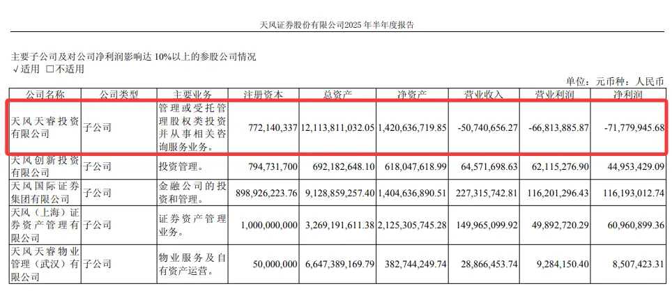 据天风证券2025年半年报,天风天睿是天风证券的全资子公司,主要业务为管理或受托管理股权类投资并从事相关咨询服务业务。截至2025年6月末,天风天睿及下属机构共管理备案基金数量22只,认缴规模为40.91亿元,实缴规模为29.92亿元。天风天睿2025年上半年实现净利润为-7177.99万元,营业利润为-6681.39万元,营业收入为-5074.07万元,总资产为121.14亿元,净资产为14.2亿元。