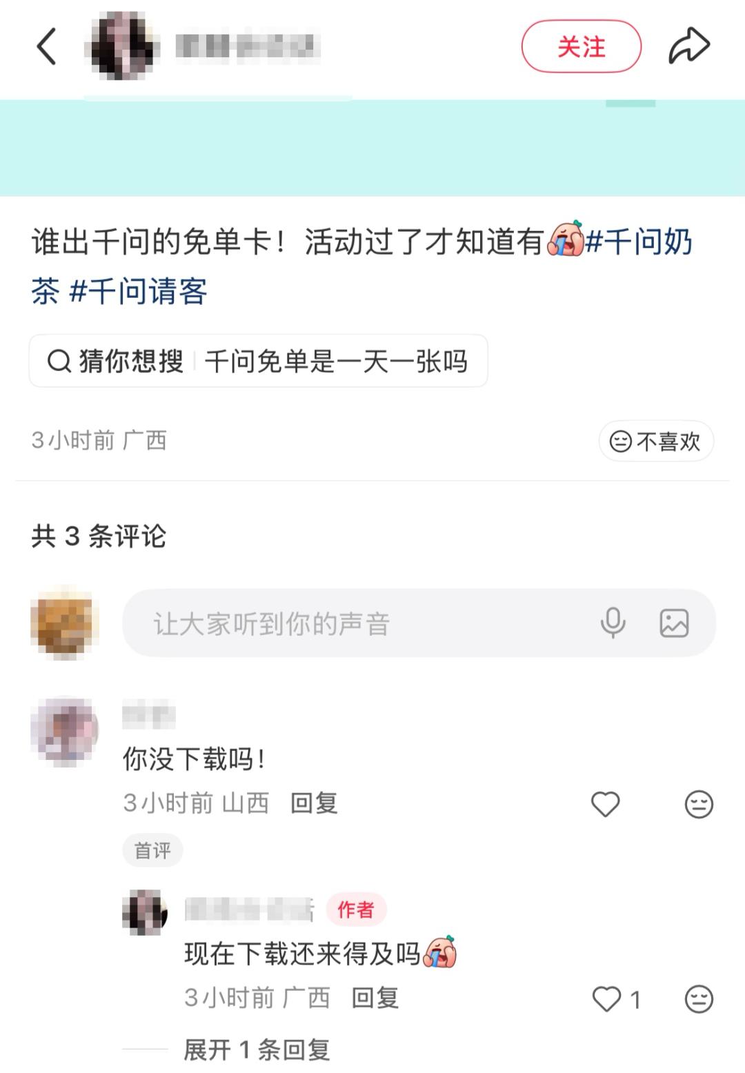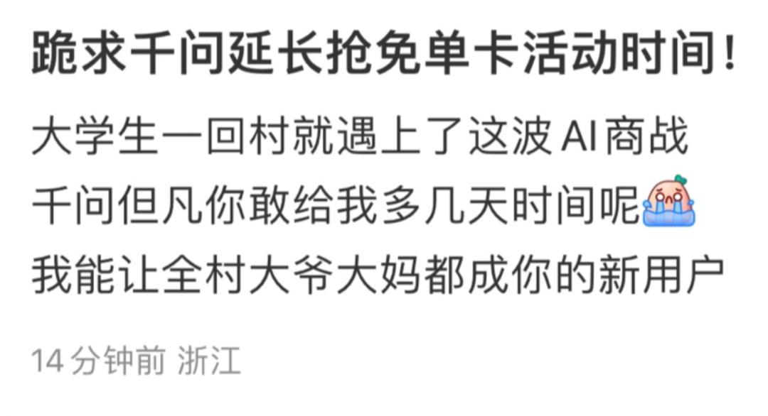 来源丨千问APP、 环球网、 都市报道 2月13日,千问发文回应网友关心的问题:休time时间到!忙了一周的千问今天要稍微休息一下。 因为——这些天看到不少朋友反馈,21张免单卡根本不够!   还有朋友刚回村准备大展拳脚,结果扭头发现,留给自己的 活动时间不多了  以及刚连上网的朋友,在线求问现在参加是否来得及。  还有的朋友希望千问能给免单卡,多研究点新用途。  大家不用担心!千问已经在连夜研究方案了,所以今天跟大家请假稍微休息一下,明天给大家一个答复,记得明天来看我 ! 此前报道: 千问呼吁:先集满21张免单卡,再慢慢错峰下单,免单卡可以一直用到2月28日;此前该活动上线仅9个小时,订单量已超过1000万单 2月7日消息,千问APP在微博上呼吁:“免单卡可以一直用到2月28号,还有21天可以用。这两天是奶茶下单高峰期,大家可以先集满21张卡,慢慢错峰下单,我们保证大家的免单卡一定能用掉哈。” 7日上午,千问APP将免单卡有效期从2月23日延长至28日,并强调可用于在盒马买鱼、买菜、买鸡蛋、买蛋糕、买年货等多品类商品。千问方面表示,目前通过千问APP点盒马商品,运力相对充足。 据介绍,每位用户最多可在“千问春节免单活动”中获得21张25元免单卡,其中1张为无门槛免单卡,登录即有,另外20张为成功邀请新用户后获得,总计价值525元。大额福利和趣味裂变玩法极大激发了用户参与热情,纷纷开启亲朋好友邀请模式,“拼的就是速度,现在邀请好友还相对容易,越早越好集满”,“必须成为相亲相爱家族群最先出手的那一个”。目前,已有大量网友在网上晒单表示“已集齐21张免单卡”。  2月6日,据千问官方,“千问春节30亿大免单”活动订单量已超过1000万单,这距离活动上线仅9个小时。  另外,官方发布温馨提醒: 1、免单卡使用期限一直到2月23日,在此之前,都可以随时使用。推荐大家错峰下单,以获得更流畅的服务体验。 2、免单卡除了点奶茶,也可以买早中晚餐和鸡蛋、青菜等生鲜百货,还可以通过千问APP买天猫超市和线下商超的年货。 3、全国的盒马门店也正在接入中,大家陆续可以通过千问APP享受到更丰富的商品免单体验。 有网友算了一笔账,活动期间,每个人可以领取21张无门槛的25元免单卡,相当于525块钱。如果一家6口人参 与千问免单活动,5分钟就可获得275元的无门槛免单卡,如果用来点单价较低的蜜雪冰城柠檬茶,可以免费喝84杯。 活动带来的高订单量,直接影响了配送行业的工作节奏。江西南昌的多位 骑手告诉 都市现场记者,今天单量激增,根本忙不过来。  不少网友也反映,自己下的的订单迟迟没 有骑手接单,商家好像也做不过来,一直在等。   据媒体在北京某商圈搜索查询发现,多家奶茶门店疑 受活动爆单影响,也 显示 “本店已休息”。 当天,部分用户称千问APP多次发生卡顿,一度无法正常完成下单付款、分享等操作。 值得关注的是,这类因福利活动引发奶茶门店爆单的情况并非首次出现。 2025年7月外卖平台补贴大战期间,“奶茶咖啡” 类订单占比超60%,彼时不少门店店员面对数米长的堆积小票,加之物料短缺,曾出现当场崩溃大哭的场景。 【来源:潇湘晨报】