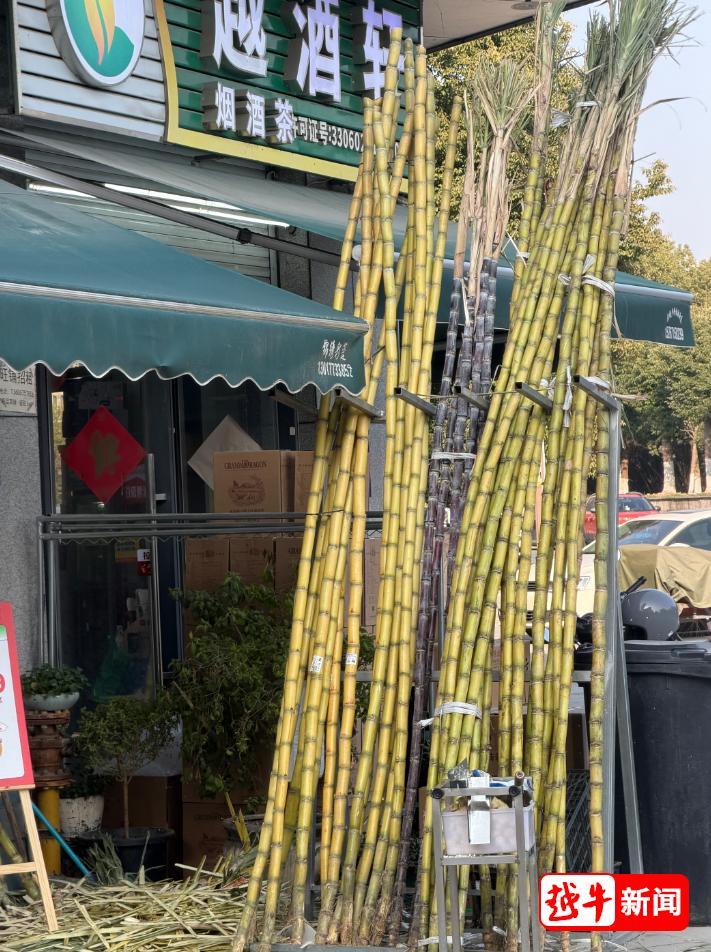 在该店门口最显眼的位置,并排摆放着三捆甘蔗。越牛新闻记者观察到,右边是市民最熟悉的青皮甘蔗,粗壮扎实,按根售卖,18元一根。中间是紫皮甘蔗,色泽深红,标价15元一根。