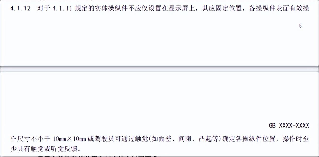 新修订的《汽车操纵件、指示器及信号装置的标志》中增加了对实体操纵件的装备和技术要求,“如果具备对应功能,则应装备实体的转向信号灯开启/关闭操纵件、危险警告信号灯操纵件、喇叭操纵件、倒车挡(Reverse)操纵件、空挡(Neutral)操纵件、前进挡(Drive)操纵件、驻车挡(Park)操纵件、前风窗玻璃刮水器操纵件、前风窗玻璃除霜除雾操纵件、车载事故紧急呼叫系统(AECS)操纵件、电动汽车驱动系统电源切断操纵件、车窗升降操纵件、灯光总开操纵件、前照灯远光操纵件、前照灯近光操纵件、前位灯和后位灯操纵件、后雾灯操纵件、组合驾驶辅助系统激活操纵件、辅助制动装置操纵件。” 也就是说,转向灯、双闪灯、倒车挡、前进挡、停车挡、雨刮器、车窗升降以及智能驾驶辅助的激活开关等都必须配备实体操纵件。当然,新国标也没有禁止说不能继续使用屏幕换挡,车企如果愿意,也可以同时配备两套系统,一套是实体操纵件,另一套采用屏幕换挡,让驾驶员自己选择。不过,未来还有没有必要继续保留两套操作系统,到时就要看市场需求了。 不仅如此,新国标还对于实体操纵件的位置、大小也有要求,“不应仅设置在显示屏上,其应固定位置,各操纵件表面有效操作尺寸不小于 10mm×10mm 或驾驶员可通过触觉(如面差、间隙、凸起等)确定各操纵件位置,操作时至少具有触觉或听觉反馈。”