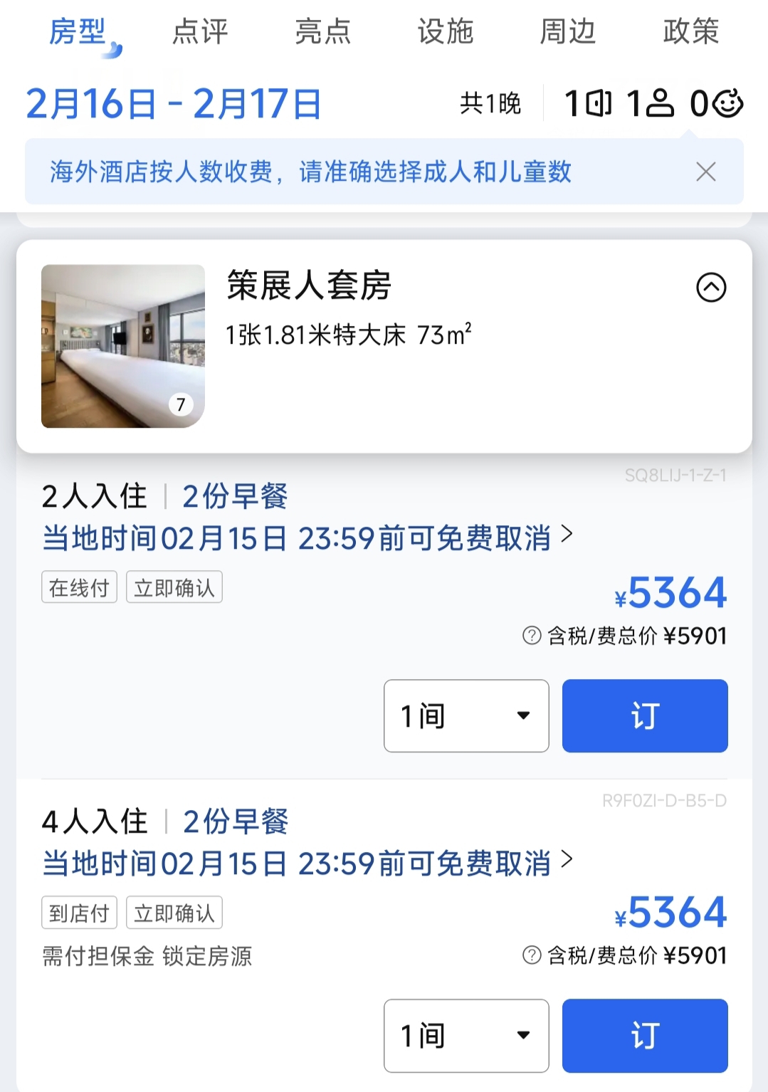 极目新闻记者在携程平台查询了解到,上述“超长”大床房是一家位于韩国首尔的酒店,于2018年开业,该房型名为“策展人套房”,面积为73㎡。目前,除夕夜的预定价为5364元一间,含税价为5901元,包含两份自助早餐。