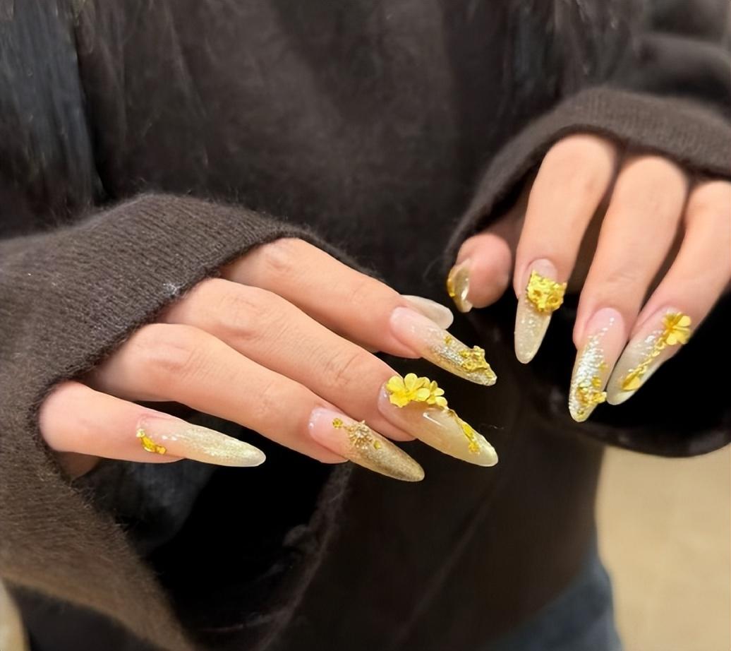图片来源:美甲店店员 鉴于当前黄金价格较高,大多数美甲店都要求顾客自备金饰来店加工。美甲店会根据制作工艺的难易来收取费用,包含款式费、饰品费、黄金加工费等,整体美甲的价格区间在600元~1500元。“操作难度并不大,与普通装饰品相似。主要是粘得牢不牢。最长能维持一个月,但如果掉了,不在我们的责任范围内。”一名美甲师向每经记者表示。 “金饰的简单拆剪我们可以完成,但有些项链、耳环需要去金店专门分拆后,再带来做美甲。”采访中,多名美甲师均告诉记者,顾客带来的金饰多为老庙黄金的金花耳钉、中国黄金的蝴蝶花朵项链等知名品牌的金饰。