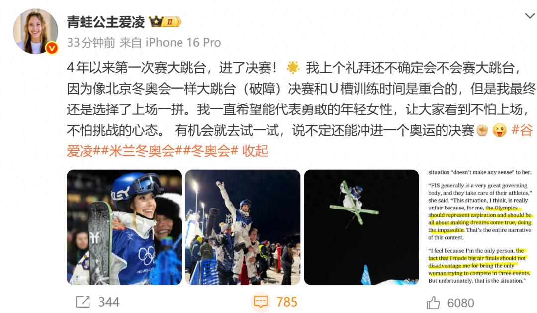 2月15日,谷爱凌发文:4年以来第一次赛大跳台,进了决赛! 我上个礼拜还不确定会不会赛大跳台,因为像北京冬奥会一样大跳台(破障)决赛和U槽训练时间是重合的,但是我最终还是选择了上场一拼。我一直希望能代表勇敢的年轻女性,让大家看到不怕上场,不怕挑战的心态。 有机会就去试一试,说不定还能冲进一个奥运的决赛。