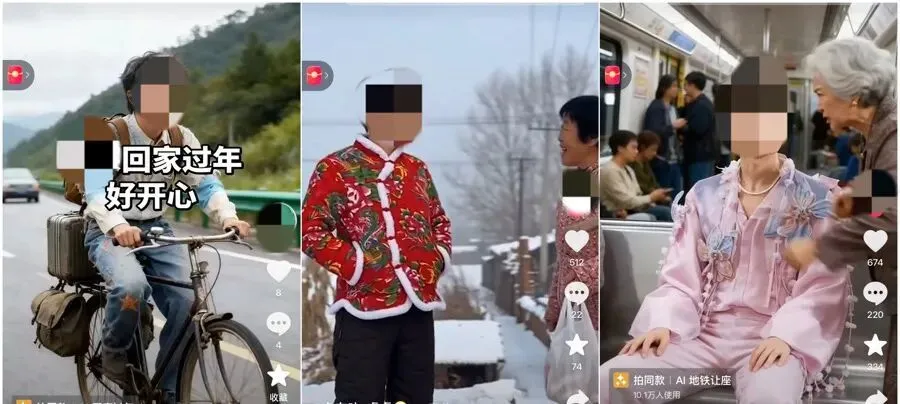 在社交平台上,有很多使用AI生成的拜年视频,有的是用户个人“虚实结合”的视频,有的是以知名人士为主角的“拜年视频”“回乡视频”。其中,部分用户的个人视频虽然肉眼就能判断出存在AI生成内容,但打“AI生成”标签的不多;而以知名人士为主角的视频,虽然有明显的“AI生成”标记,但相关内容存在恶搞嫌疑。