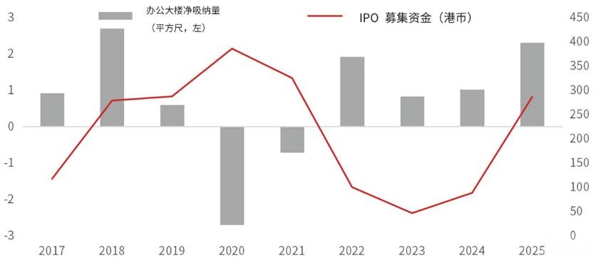 香港金融实力晴雨表的办公楼市场,正逐步迈向供需平衡。2025年净吸纳量飙升至230万平方尺(为2018年以来最高水平),主要受对冲基金、财富管理公司和中国内地企业的带动。企业需求与资本市场的复苏同步,首次公开招股(IPO)和股市的活跃刺激了扩张。