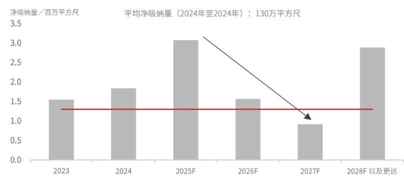然而,供应仍然巨大。2026年将新增156万平方尺的甲级办公楼,尽管空间吸收率有所提高,但预计空置率仍将维持在15%左右。这种供需失衡可能会持续存在,并继续对租金和估值构成压力。尽管如此,市场稳定的迹象正在显现,租金的跌幅已显著收窄。预计从2027年起,新增供应量也将放缓。