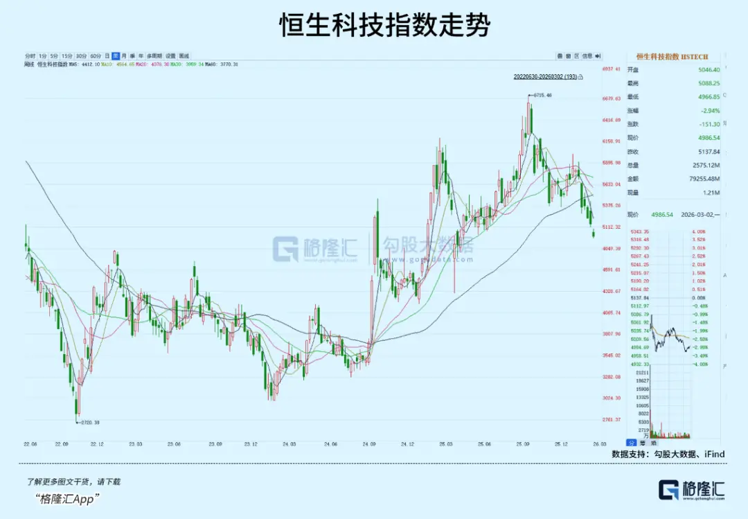 作为离岸市场,港股对海外流动性变化较为敏感,短期走势受地缘冲突因素影响较大。每次这种风险事件出来,港股都会抗下所有,下跌幅度都要远远大于A股。上一次是2022年俄乌冲突,再上一次是2020年全球疫情。
