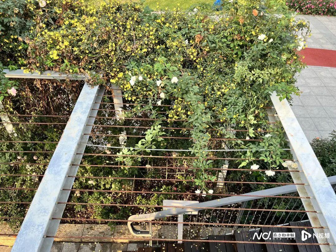 3月3日13点左右,记者来到市民所述地点,在香蜜公园木栈道的台阶旁,月季和常绿钩吻藤爬满一整面墙,不少市民路过此处时会驻足拍照。而常绿钩吻藤主要位于花墙上部,逐渐向棚架顶部延伸,栈道台阶和路面均落下不少黄色花朵,触手可及,但现场并未设置任何安全警示标志。