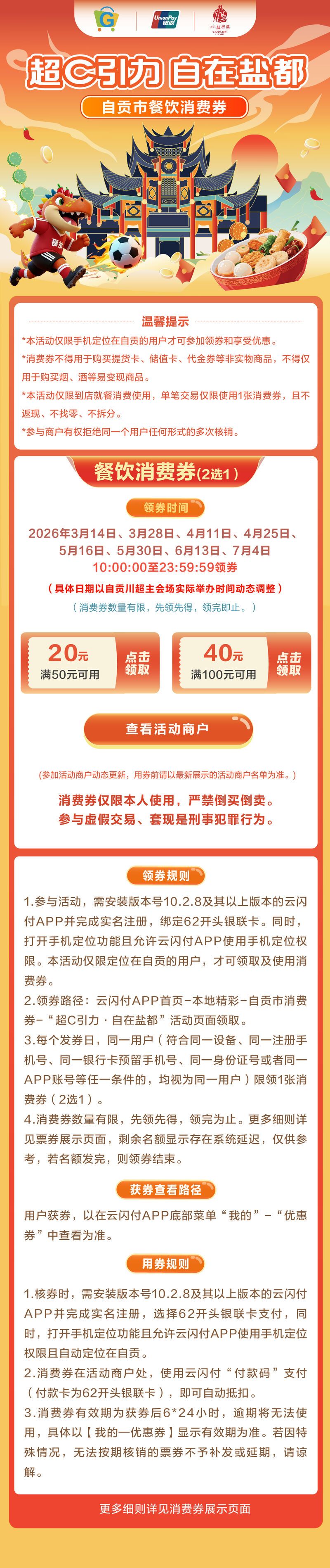 备受瞩目的川超决赛阶段战火即将重燃,一场融合赛事激情、美食体验与消费优惠的全民狂欢又将开启。3月12日,记者从自贡市商务局获悉,3月至7月,自贡将在川超赛事主场比赛日发放总额80万元“超C引力·自在盐都”消费券,每场发放10万元。首轮消费券将于3月14日10:00至23:59:59发放。 资料图片据介绍,“超C引力·自在盐都”消费券将于3月14日、3月28日、4月11日、4月25日、5月16日、5月30日、6月13日、7月4日分八期派发,面额包括“满50元减20元”“满100元减40元”两种。发券日10:00至23:59:59领券,领券后6天(6*24小时)内有效。如何领取?手机GPS定位在自贡市内的消费者,可登录“云闪付App首页-本地精彩-自贡市消费券-‘超C引力·自在盐都’活动”页面领取。单用户每个发券日限领1张消费券(二选一)。