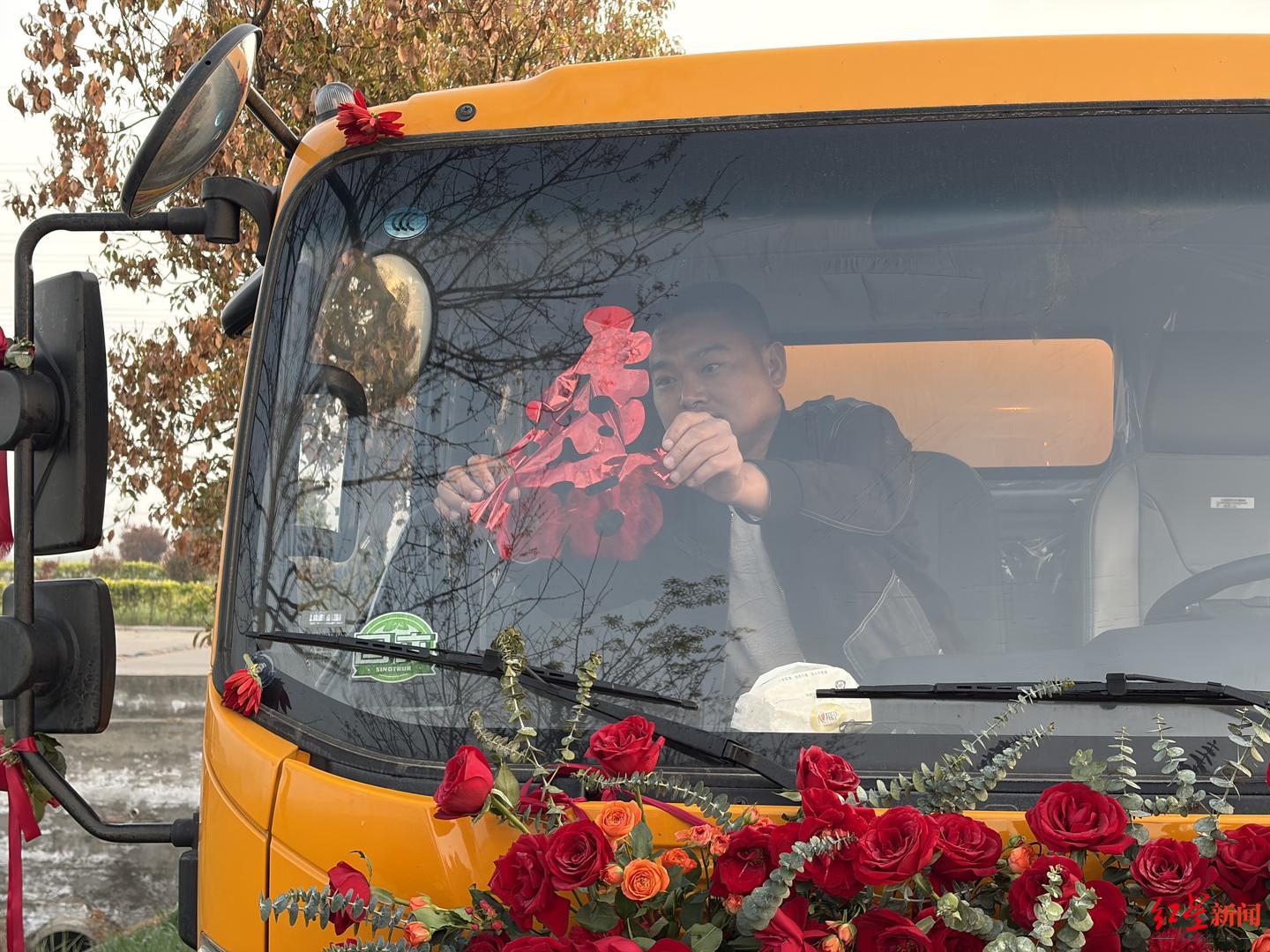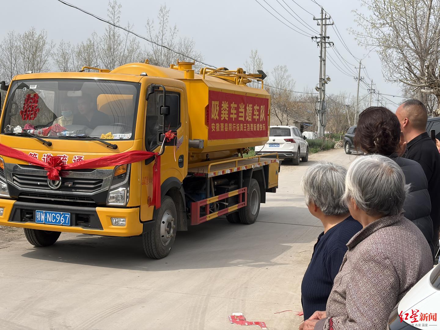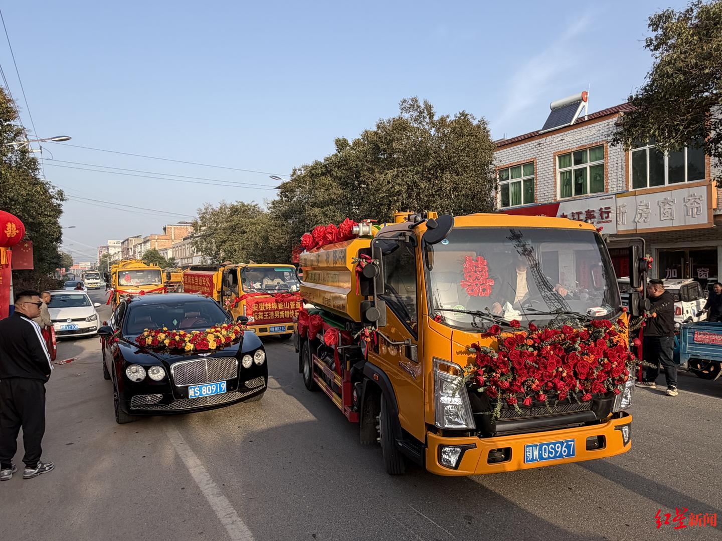 3月28日早晨5点,一路迎亲车队的车灯和轰鸣,叫醒了安徽省淮北市濉溪县还在沉睡中的大潘家村。和不少新人的迎亲车队一样,婚车中云集了路虎、奔驰、奥迪等车,但是和其他新人不同,迎亲车队中还有9辆来自全国各地的粪便清运车。  迎亲车队准备向新娘家进发 95后的新郎潘浩男是一名粪便清运工,就在婚礼举行的10天前,他通过短视频平台发布邀请,希望各地的同行能开着粪便清运车来参加他的婚礼。最终,共有9辆粪便清运车被编进了迎亲的车队。 “我希望用这样的方式,让更多人觉得我们所从事的工作是有价值的,也让我们的同行能够有机会在一起热闹热闹。”潘浩男说。 同为95后的新娘李雅晴,住在距离潘浩男老家两个小时车程的安徽亳州蒙城县,她毕业后曾在当地做过四年多的幼儿园老师,直到遇见在现在浙江宁波的潘浩男,并辞职后千里奔赴。“我觉得这样的车队挺浪漫的,也不觉得他从事的工作和其他工作有什么不一样,靠双手劳动赚钱,能踏实过日子,就是我最看重的。”  新娘李雅晴和新郎潘浩男坐在粪便清运车上 95后“掏二代”结婚 网上征集吸粪车组成迎亲车队 新郎潘浩男和新娘李雅晴婚礼的前一天晚上,来自山东、安徽、湖北的9辆黄色粪便清运车便陆续来到大潘家村。  同行在给迎亲车队的掏粪车帖喜字 这是一个有400户左右的村子,田里种植的小麦已经满绿,巨大的风力发电机在田里缓慢转动。 村中年轻人多数在外工作,很多老人许久没见过这么热闹的场景,围在这几辆或大或小的吸粪车周围走走停停。“这车子停在您门口您介意吗?毕竟是运送粪便的。”“这些车看着外表干干净净的,人家靠自己辛苦赚钱,有什么嫌弃的。”面对询问,有村民如是说。  大潘村的村民在围观潘浩男的迎亲车队 3月18日,新郎潘浩男曾在短视频平台上发布征集粪便清运车(吸粪车)为自己婚礼组建车队的内容。陆续有50多名全国各地的同行联系到他,希望开着自己的吸粪车来参加他的婚礼。 潘浩男在短视频平台上的昵称是“江浙沪粪王—浩男”。2017年他从成都的一所大学影视编导专业毕业后,经历过创业、上班,最后在2023年初,决定跟随从事粪便清运工作多年的父亲潘峰“继承家业”,成了一名“掏二代”。舍不得丢掉视频拍摄剪辑手艺的他,利用闲暇时间将日常粪便清运工作的内容制作成小视频发到网上,已累积了近6万粉丝。  从事粪便清运工作时的潘浩男 最终,考虑到村子的“承载力”和接待能力,潘浩男只邀请了其中的9辆粪便清运车加入他的迎亲车队。 “千里奔赴” 新娘辞掉干了多年的幼师工作 潘浩男一家平时从事粪便清运的地方在浙江宁波的慈溪市,那里距离他的老家安徽淮北有600多公里的距离。虽然生活工作的重心早已在宁波,考虑到“故乡情结”,他们决定将婚礼放在淮北老家举办。 新娘李雅晴的老家亳州蒙城县距离潘浩男的老家有2个多小时的车程,为赶在当天中午前开启婚宴,28日凌晨5点,迎亲车队便从大潘家村出发了。 一路上,车队路过村镇、市集,28日这天,是农历二月初十,算是结婚的好日子,路上迎亲车队不少,但是潘浩男的车队无疑是最引人注目的。 “这肯定是头一次见啊,之前哪见过这种,我觉得还挺好。”在路边卖早餐胡辣汤的朱先生说,当天一早路过摊子门前的迎亲车队不少,但是唯一吸引他掏出手机录视频的,也只有这几台作为迎亲车的粪便清运车。  路边的村民在拍摄掏粪车车队 两个多小时的车程后,当车队到达新娘李雅晴家时,天色已经大亮。  迎亲车队抵达新娘家 送亲队伍中,李雅晴的弟弟小喆(化名)前后忙活着,搬运姐姐的嫁妆、一起参与婚礼现场的布置安排,显现着替姐姐高兴的兴奋劲儿。 不过,去年刚得知姐姐和“掏粪男孩”潘浩男恋爱的消息时,这个大学刚毕业的小伙子曾因为担心姐姐未来的生活,当着李雅晴和潘浩男的面,连着流泪一个小时。李雅晴曾在老家当过四年多的幼儿园老师,遇到潘浩男后,她辞职并千里奔赴。 “我毕业之后在浙江义乌工作,距离他们俩所在的宁波慈溪不远,有一次他们来看我,并告诉了我他们在一起的消息,当我得知姐姐男朋友从事的工作时,心里还是有一些介意的。当天喝了一点酒,开始担心起姐姐以后的生活,哭哭啼啼了很久。”小喆说,随着和这个“未来姐夫”越来越多的接触,他逐渐觉得姐姐的选择或许并没有错。 小喆告诉红星新闻记者,“只要姐夫是一个靠谱踏实的人,能够让姐姐未来的生活有依靠,过得幸福就可以了。”  新郎和新娘 作为95后的新娘李雅晴,也曾对婚礼心怀浪漫想象,“他当时和我说了想要组吸粪车迎亲车队的想法,我并没有什么介意,反而觉得倒也挺浪漫的。倒是他父母一度有点儿迟疑,后来我说没关系,他父母也接受了。” 李雅晴现在也会偶尔和潘浩男一起出车,“不知道为什么,我从一开始就不反感这个活儿,反而很喜欢和他待在一起。” 掏粪工的日常: 有人可“换下工作服就开路虎下班” 去年7月,红星新闻记者曾前往宁波慈溪,采访过潘浩男和李雅晴。随后,“95后掏粪工上班开粪车下班开奔驰”话题在微博上引发近两万人讨论。  工作时的潘浩男 20多年前,潘峰带着妻子陈珊和当时只有4岁的儿子潘浩男从老家来到慈溪打工,潘峰一开始在服装厂做流水线工人,每个月有400元左右的收入,后来他觉得这并不能让家人过上更宽裕的生活,便开始向老乡