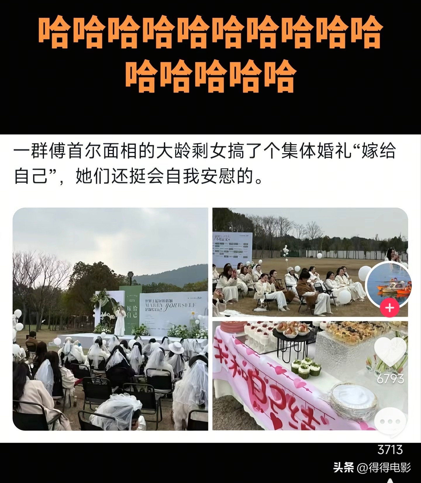 云南某网红组织举办“自己嫁自己”的活动,叫了一群大龄剩女跑到大理,头纱、皇冠、婚纱一应俱全,齐码齐号围坐在草坪上,拿着话筒不知道在说什么。