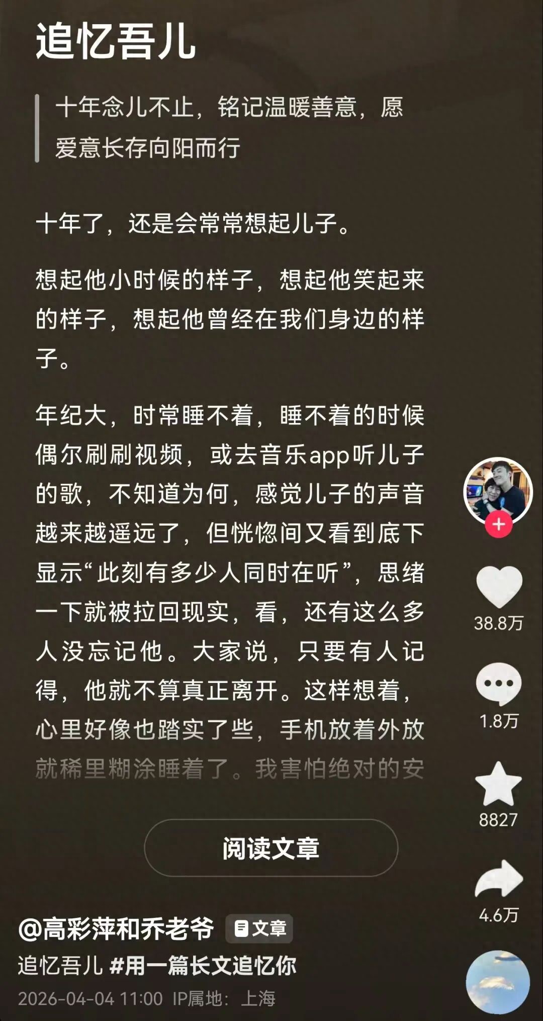清明前夕,歌手乔任梁父母在社交平台发长文悼念儿子。 “这十年,我们老两口也在努力好好生活。萍姐从前上台说话都会紧张到晕过去,现在竟然能稳稳直播;而我居然成了一个美食博主,可惜,做菜还是很难吃,总做黑暗料理,总把厨房搞得乱七八糟,辛苦萍姐帮我收拾。日子总是在打打闹闹中度过,我们也会带着你的那份温暖一起往前走。