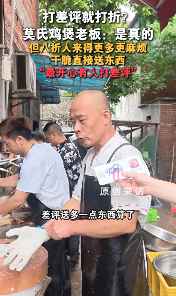 鸡煲老板回应打差评打折:“是真的,但如果差评打八折人来得更多,那就更加麻烦,不如送多点东西,最开心有人打差评了。”
