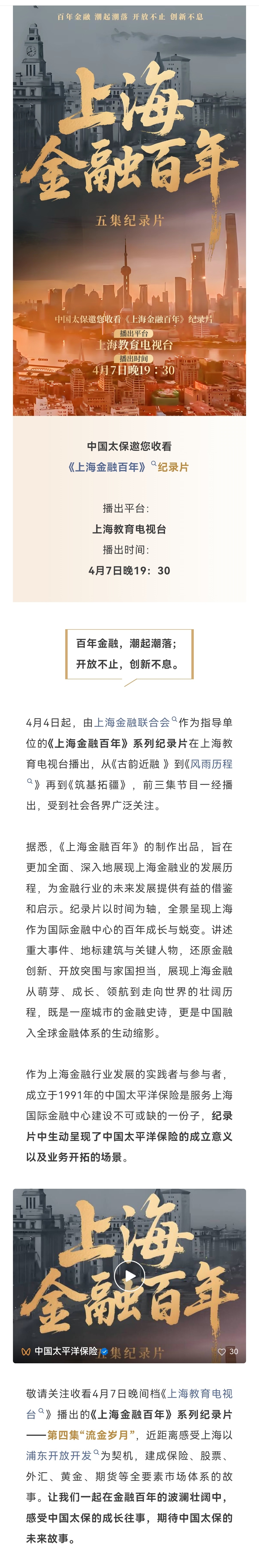 [个人] 预告|《上海金融百年》纪录片里的中国太保,今晚约!