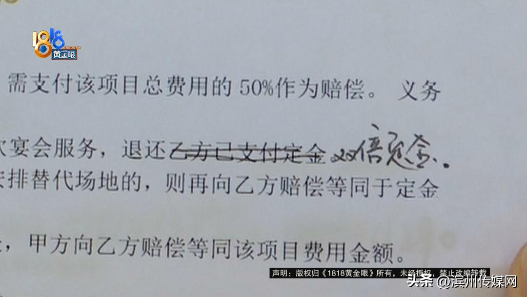 根据她和“理想禧宴”的合同,如果无法提供服务,甲方要在宴会前90天内以书面形式通知乙方,退还乙方已支付定金,这里的“已支付定金”被划掉了,又手写了“双倍定金”。