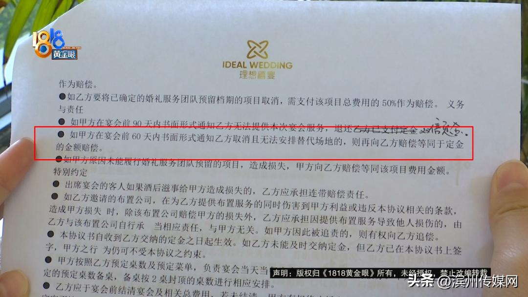 还有一条写着甲方在宴会前60天内书面通知取消且无法安排替代场地的,则再向乙方赔偿等同于定金的金额。