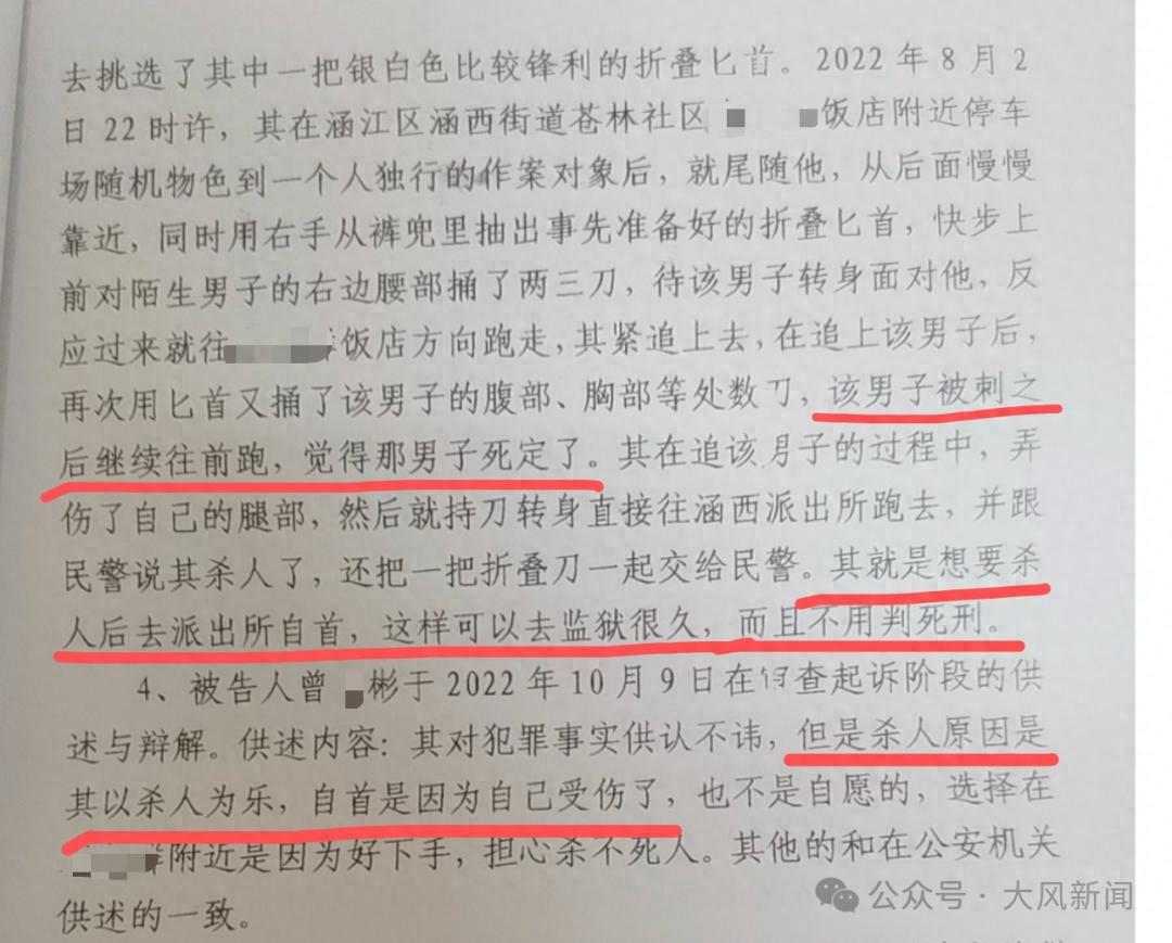 法院一审刑事判决书显示,曾某彬在作案后,主动前往涵西派出所投案,称系“认为该男子必死之后,才持刀投案”。其就是想要杀人后去派出所自首,这样就可以去监狱很久,而且不用判死刑。