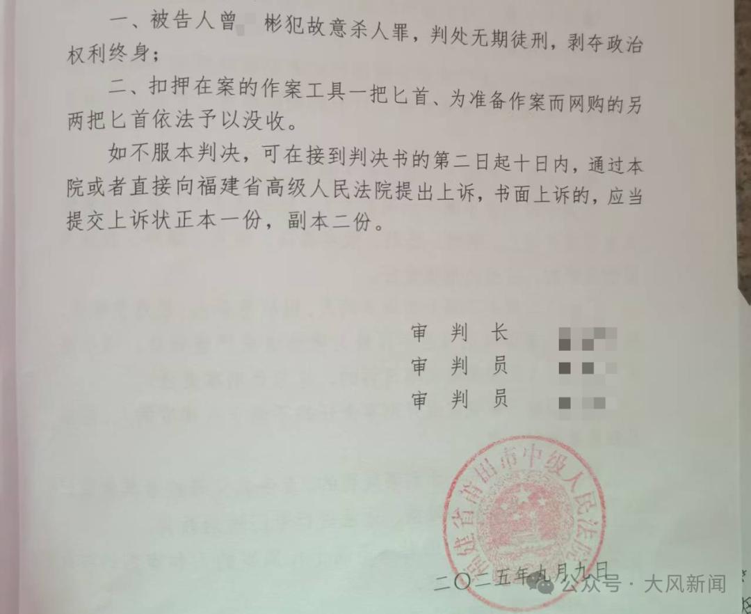 2023年1月21日,莆田中院一审判处曾某彬死刑,剥夺政治权利终身;赔偿林金灿及其家人经济损失5.5758万元。