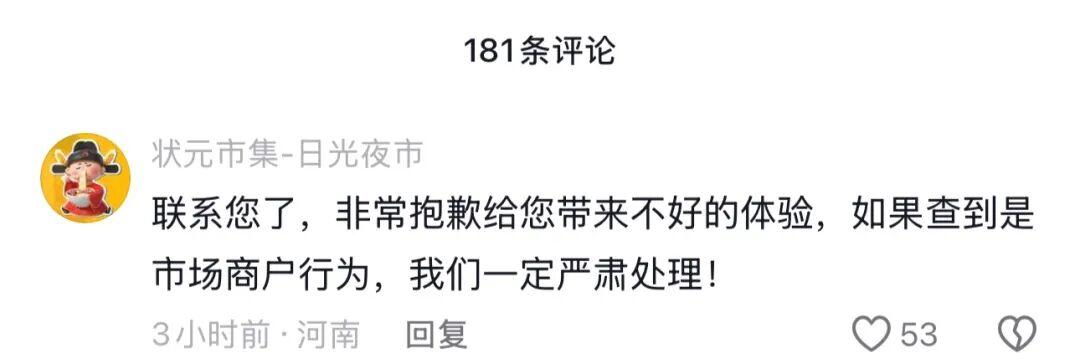 4月7日下午,大皖新闻记者联系到状元市集运营管理方。对方回应称,目前正在就游客反映的情况进行核实,“我们也尝试联系了发帖人。”该工作人员表示,此前市场方并未接到或发现类似投诉,“我们有自己的团队在排查,但目前还不能确定是哪家商户的行为。一旦核实清楚,我们会及时进行公示。” 当天下午,记者也就此事致电洛阳市西工区市场监督管理局。该局工作人员在了解网帖内容后表示,局办公室目前尚未收到相关投诉,“我们现在已经安排所里的同事去状元市集了解情况,到现场调查核实。” 来源:大皖新闻