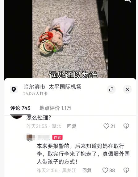 4月8日,有网友在社交平台发布视频,称在哈尔滨太平国际机场看到一名外国婴儿独自躺在地上,周围未发现家长陪伴,随即引发网友对“弃婴”、“失职家长”的猜测。 该网友后续在评论区回复称,原本打算报警,随后得知孩子母亲正在取行李,取完后已将孩子抱走,并感慨“真佩服外国人带孩子的方式。”评论区仍有不少网友留言,怀疑是否为遗弃,并且担心孩子后续安全问题。  △视频画面截图  4月9日,潇湘晨报·晨视频记者后台私信联系当事人尝试了解情况,暂未收到回复 随后记者致电哈尔滨太平国际机场相关部门,太平国际机场国际问询客服告诉记者,已了解相关视频并核实情况,目前未收到孩子丢失的反馈,同时解释“中西方带娃习惯存在差异,外国人常将孩子临时放在地面,若出现长时间无人认领情况,民航及公安部门会介入。” 机场公安局指挥中心工作人员则表示未接到相关警情通知,会调取监控排查。  △视频画面截图 9日上午,视频拍摄者发布最新回应,称事件实际发生在4月6日,当时孩子的父母就在附近取行李,并非网传的“弃婴”,发布视频是因为觉得外国人带娃的方式让自己觉得很震惊没想到会引发误会,特此说明,同时也希望大家能够友善评论。 来源:潇湘晨报·晨视频记者黄康睿 实习生 彭哲涛 【来源:潇湘晨报】 |