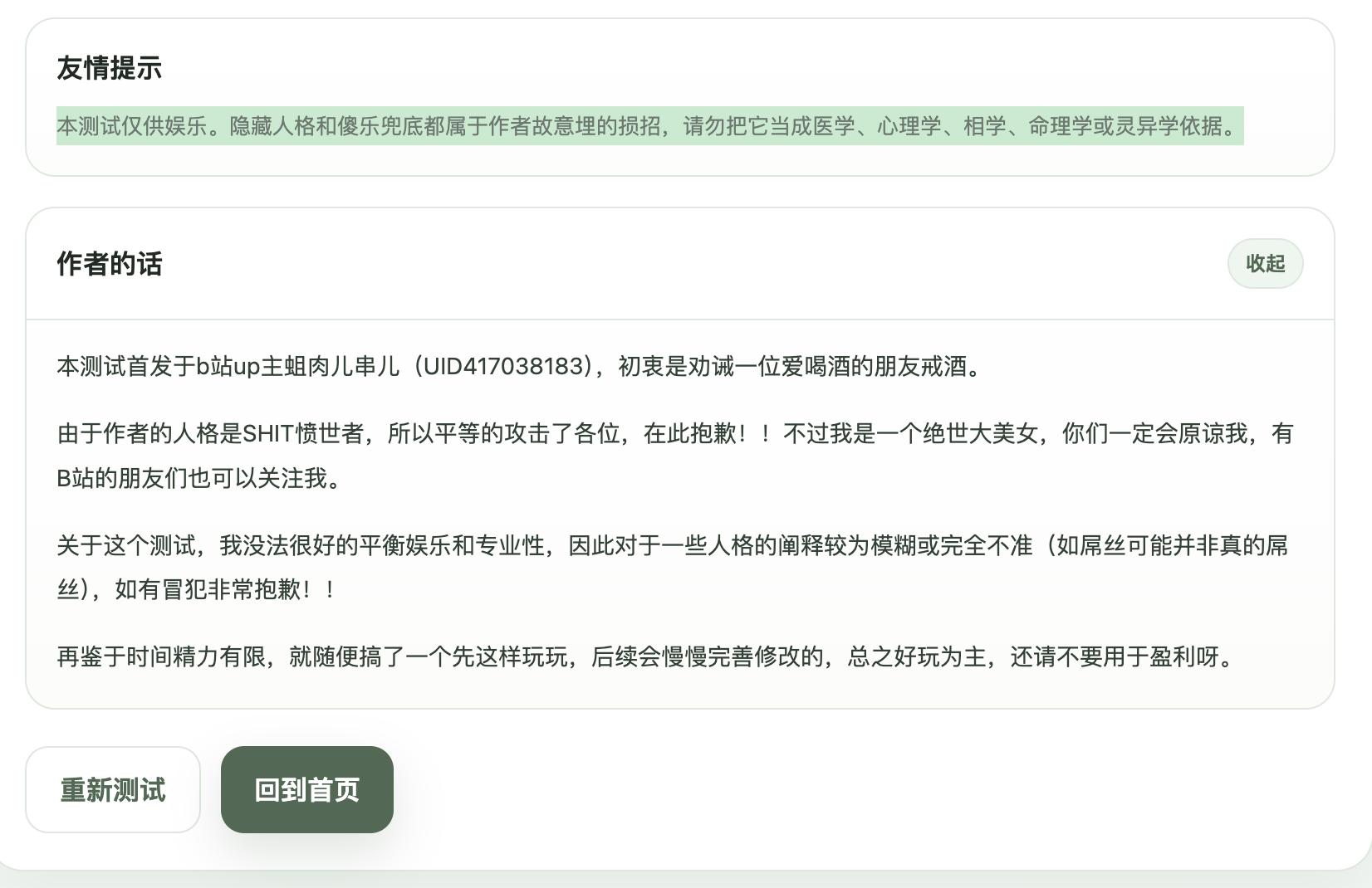 制作者友情提示称“本测试仅供娱乐,隐藏人格和傻乐兜底都属于作者故意埋的损招,请勿把它当成医学、心理学、相学、命理学或灵异学依据。”此外,制作者表示:“关于这个测试,我没法很好的平衡娱乐和专业性,因此对于一些人格的阐释较为模糊或完全不准(如屌丝可能并非真的屌丝),如有冒犯非常抱歉!”