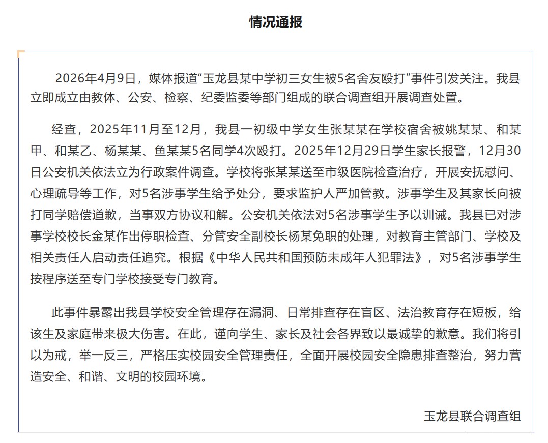2026年4月9日,媒体报道“玉龙县某中学初三女生被5名舍友殴打”事件引发关注。我县立即成立由教体、公安、检察、纪委监委等部门组成的联合调查组开展调查处置。