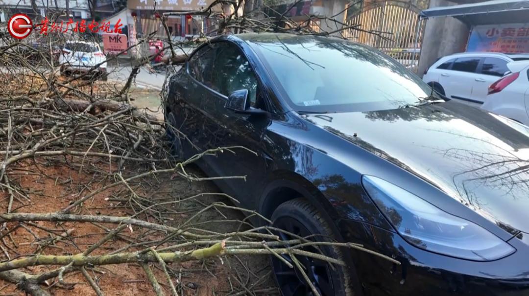 3月29日下午2点左右,万女士和家人来到贵阳市白云区黑石头村附近,将车辆停在025县道斗牛城山庄门口的道路旁后,便前往周边闲逛。从万女士的车载监控可以看到,当天下午2点42分,车辆右后方的树木开始倾斜,随后树冠部分倒下来砸向了万女士的车。