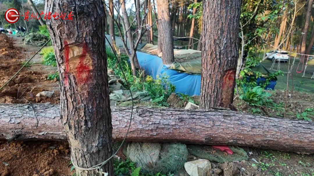 树倒了以后,我们先打110报警,也沟通了我的保险公司。我们又打了村委会的电话,村里面说这个好像不归他们管,说是林业局近期要过来砍伐树,已经做了标记的,是林业局来管。然后我们又联系了林业局,林业局说这个地界是属于村委会管,总之没有一个答复。我还联系了长坡岭森林公园,他们说这一片树不是他们的。