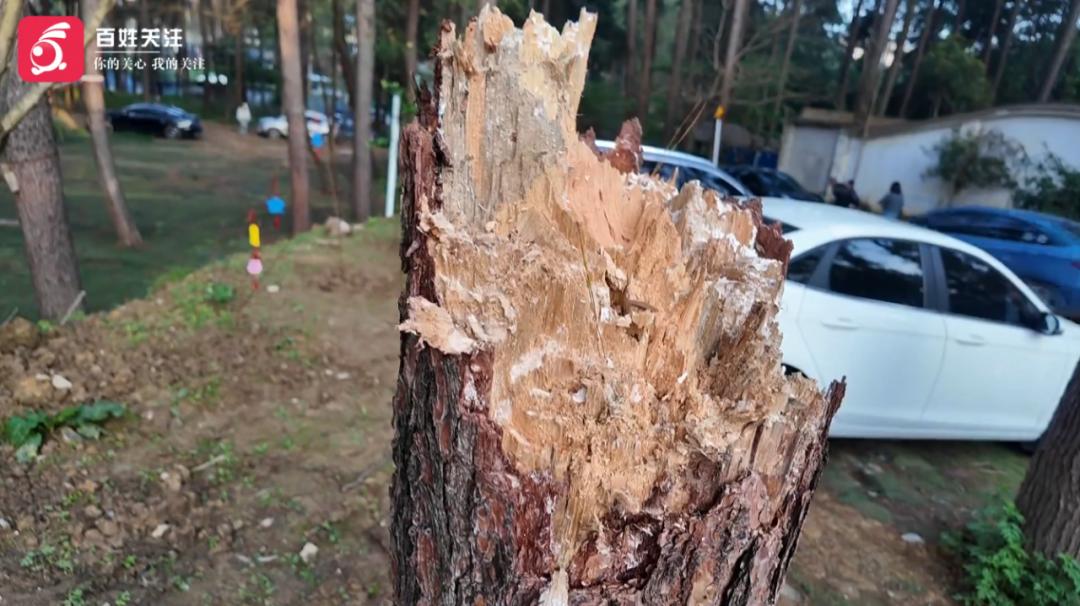 记者看到,现场一共有三棵树断裂垮塌,每棵基本都是十米以上的高度。其中最大的一棵树木主干已经断裂成几截,在树根处能清晰看到有人用油漆标记了序号。折断位置的树干内部呈现出大片白色,和树干本身的颜色有明显区别。