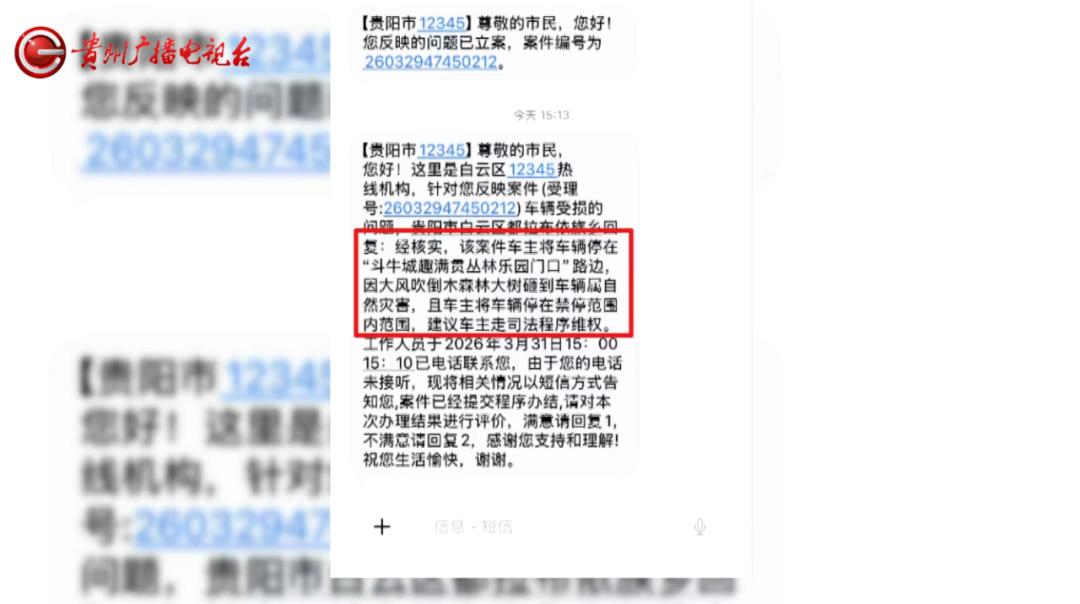 3月31号,万女士收到12345反馈短信,短信写明“因大风吹倒森林大树属于自然灾害,且车主将车辆停在禁停范围内,建议车主走司法程序维权”。看到这样的答复,万女士无法接受。这件事中,责任究竟如何划分,记者也咨询了律师。
