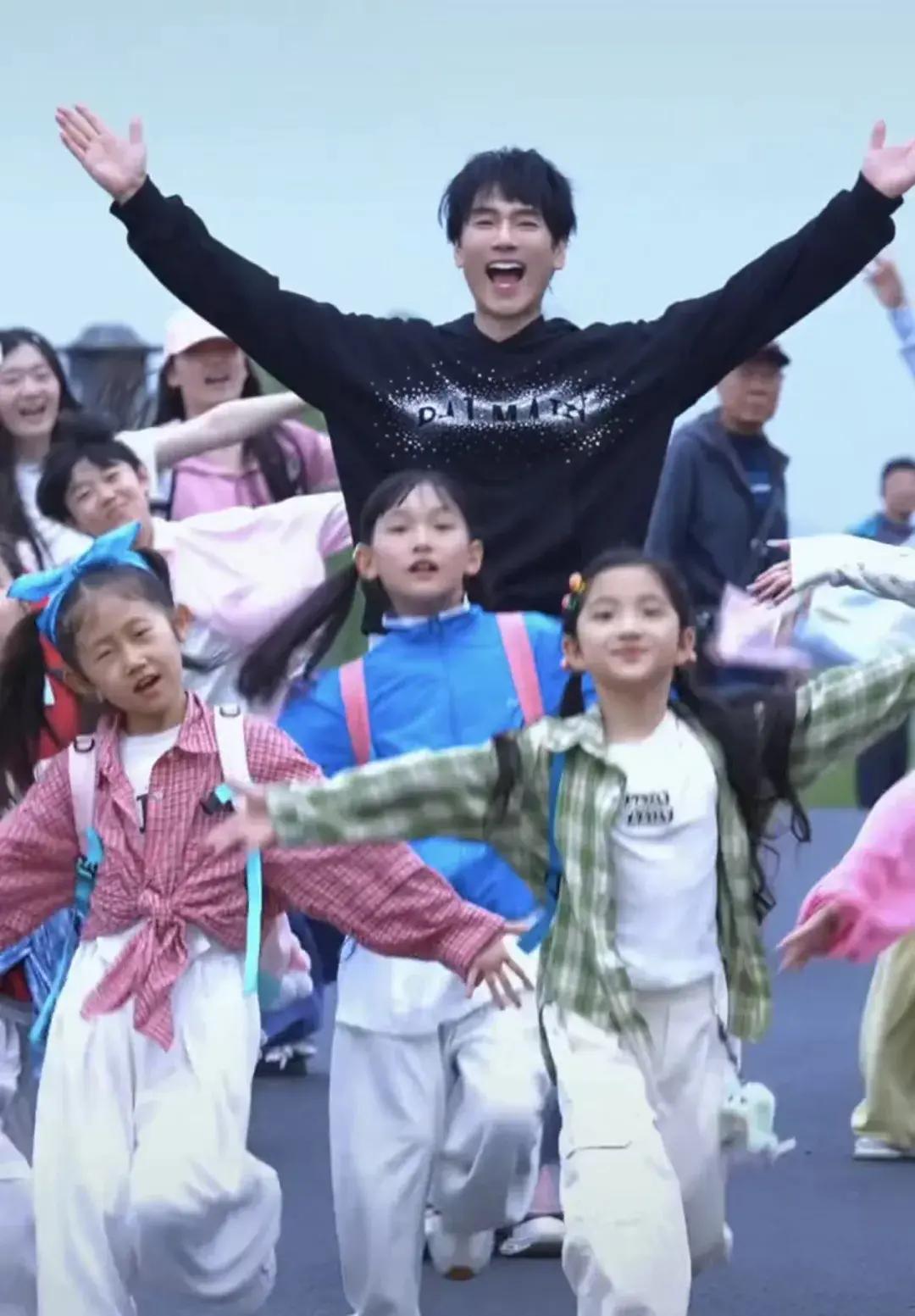 视频中,他与孩子们在杭州西湖断桥上,跳起《爱情鸟》的经典舞步。