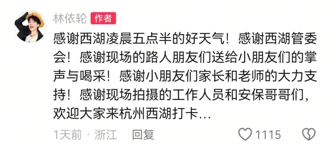林依轮还配文称,“感谢西湖凌晨五点半的好天气……欢迎大家来杭州西湖打卡。”