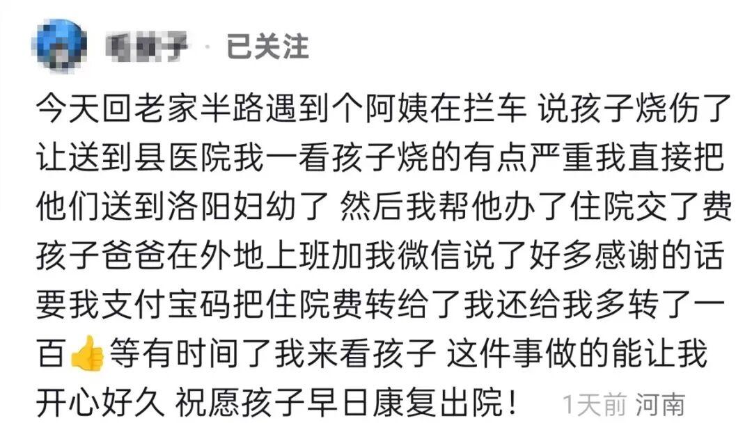 [盐都杂谈] 男子回家路上救助被烫伤孩子,帮忙办理住院缴费,家长多转钱感谢,网友点赞:河南...
