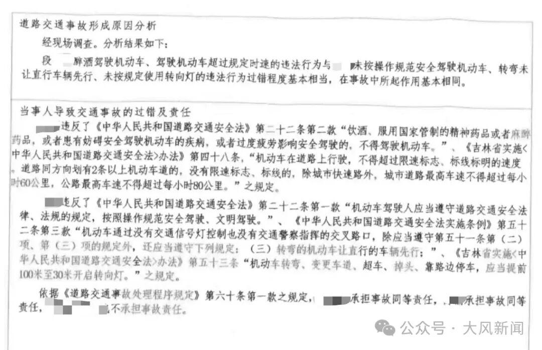 他指出,事故地点所处的通榆县美食街为双向4车道、无限速标志。大安交警出具的《道路交通事故认定书》上,提到醉驾司机段某违反了“机动车在道路上行驶,不得超过限速标志……道路同方向划有2条以上机动车道的,没有限速标志、标线的,除城市快速路外,城市道路最高车速不得超过每小时60公里……”