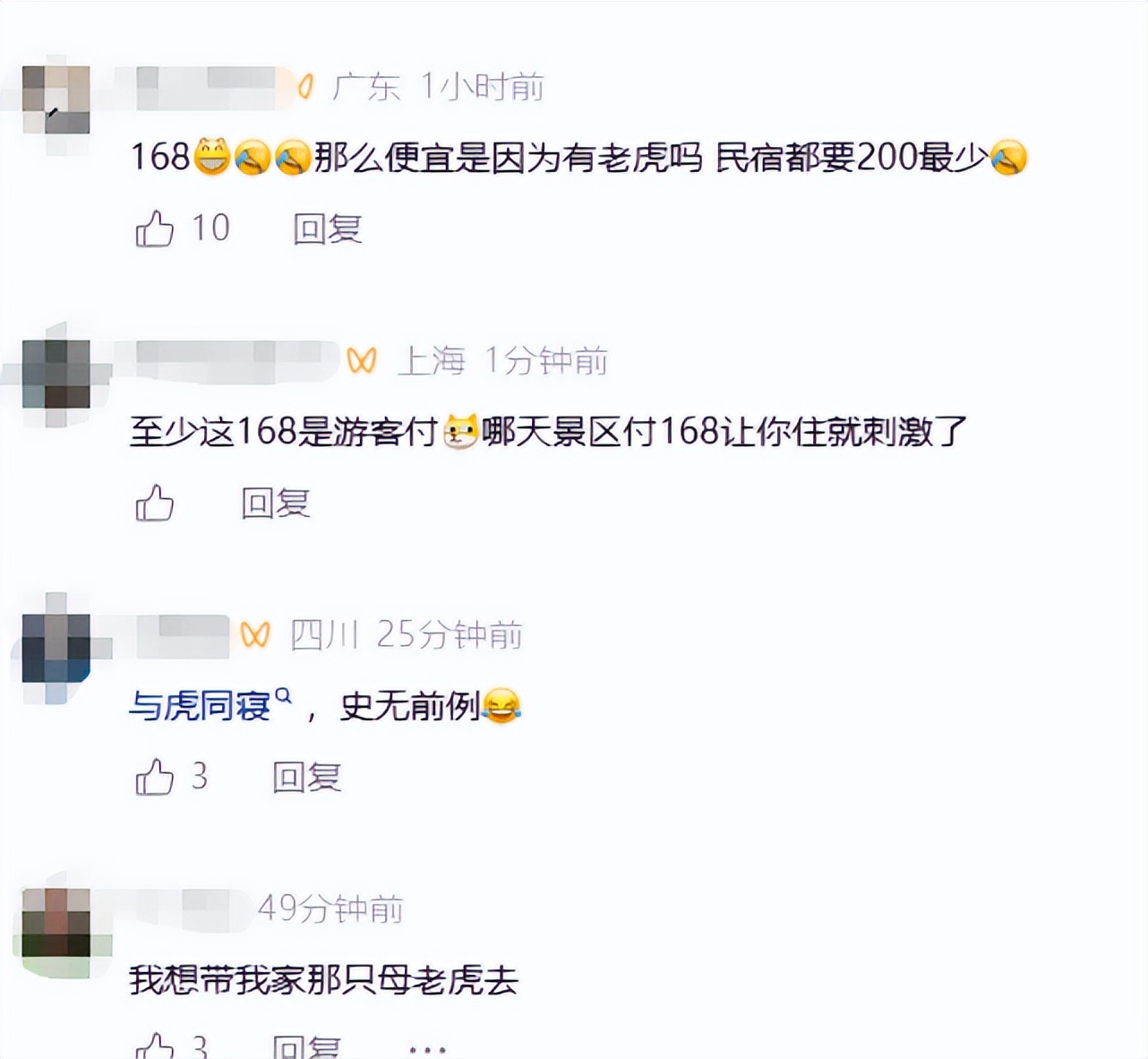 (元)那么便宜是因为有老虎吗,民宿都要200最少”,还有网友戏称此举“与虎同寝,史无前例”。