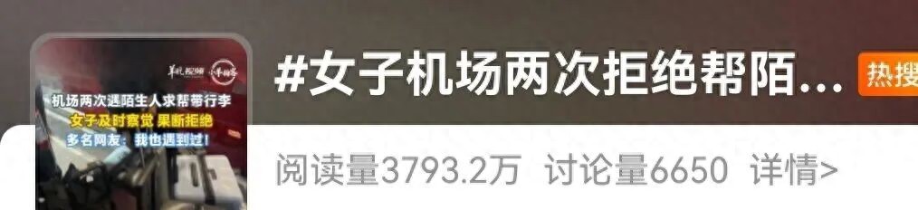 4月18日,话题#女子机场两次拒绝帮陌生人带行李#冲上热搜。