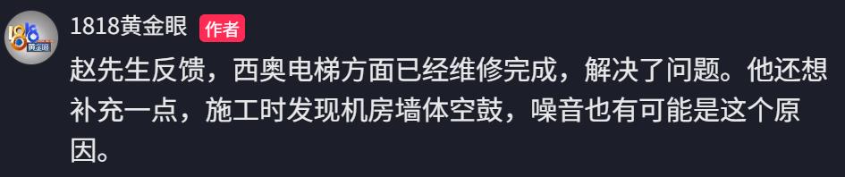 目前赵先生反馈,西奥电梯已维修完成,解决了噪音问题。施工时发现机房墙体空鼓,噪音也有可能是这个原因。