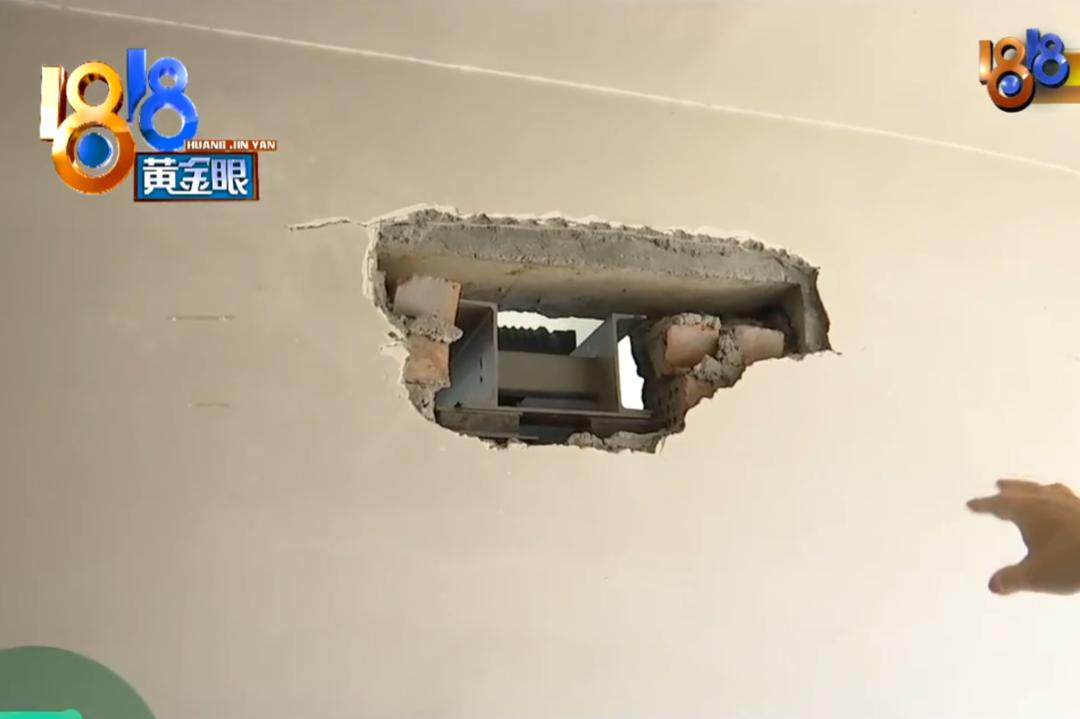 工人也凿开顶楼墙体查看减震垫是否和楼梯粘连,结果噪音也并没有减弱。