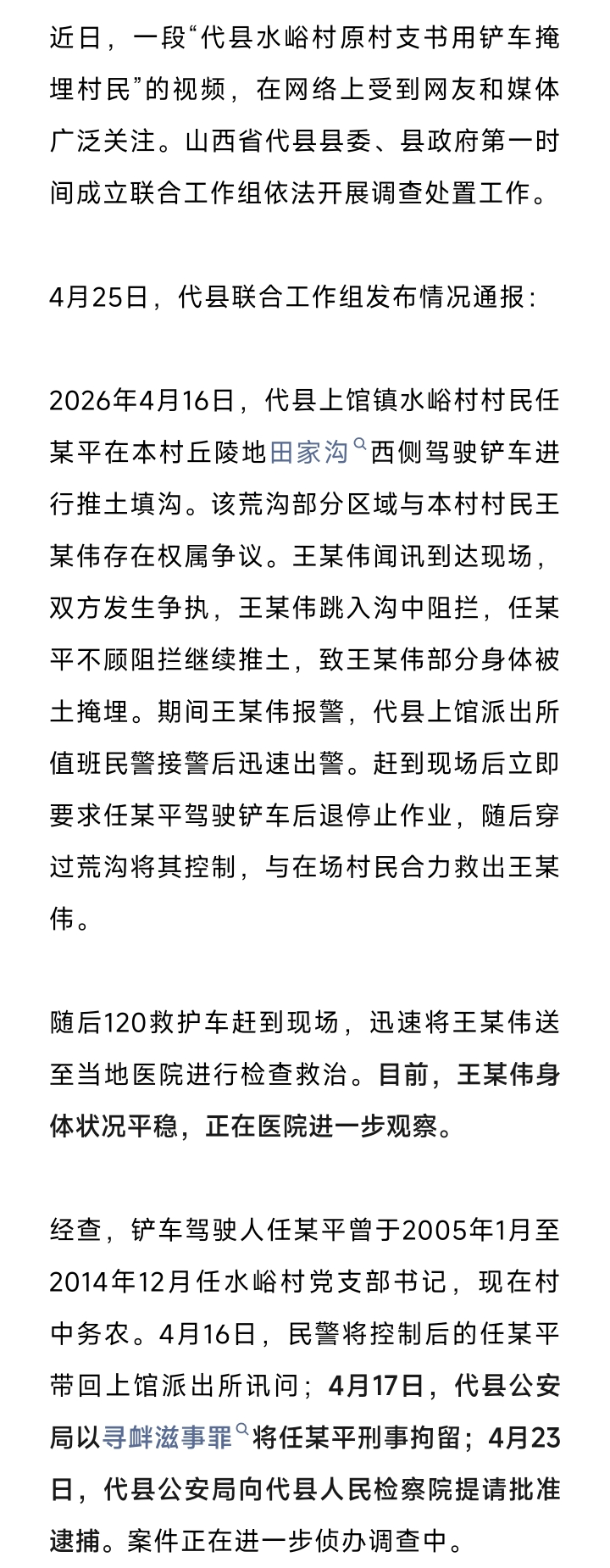 [盐都杂谈] 山西代县通报“原村支书铲车埋村民”事件:铲车驾驶员任某平被刑拘,伤者…