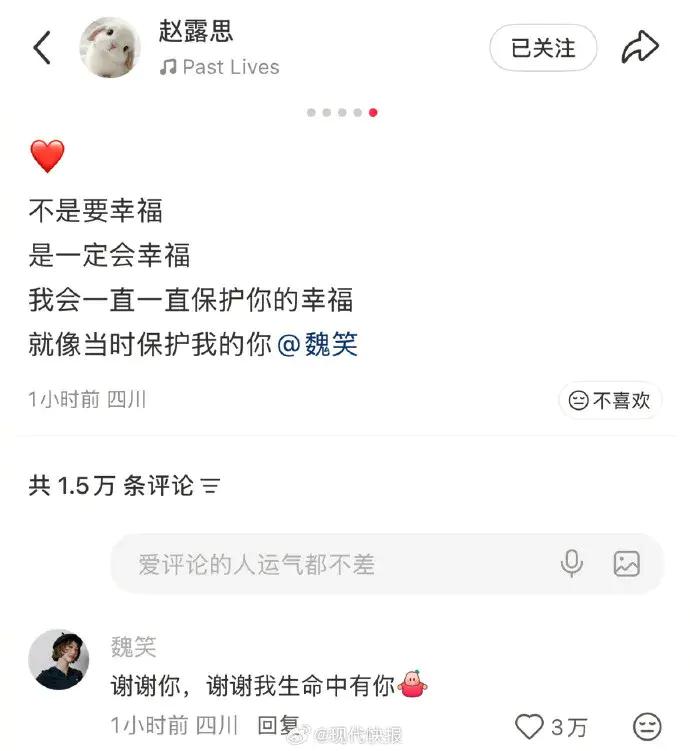 4月26日,赵露思发文送上祝福:“不是要幸福,是一定会幸福。我会一直一直保护你的幸福,就像当时保护我的你。”随后,魏笑在评论区感谢赵露思:“谢谢你,谢谢我生命中有你。”