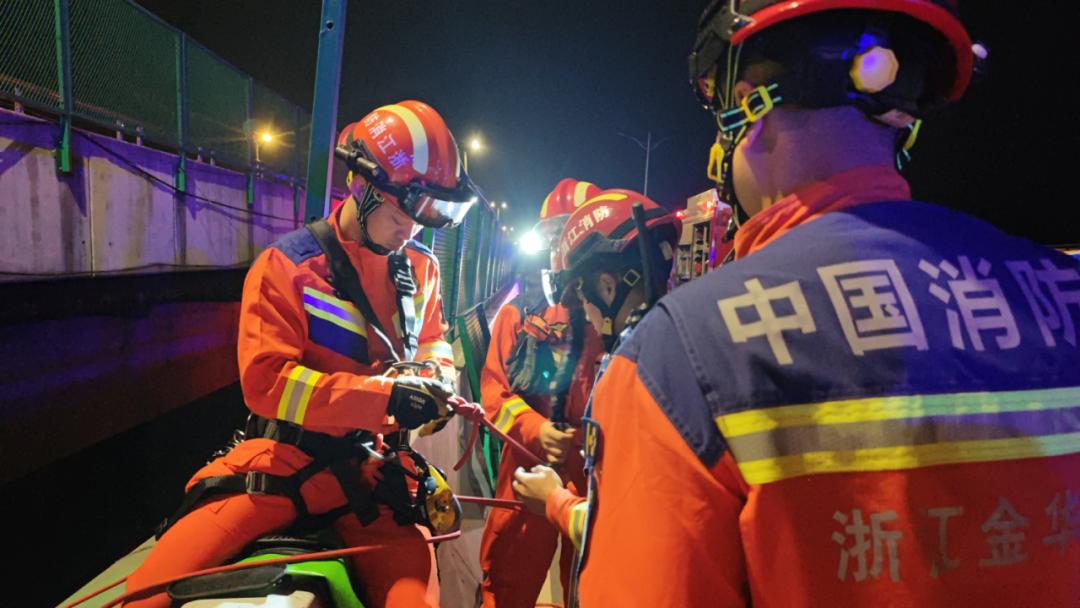 消防员索降至桥洞平台。